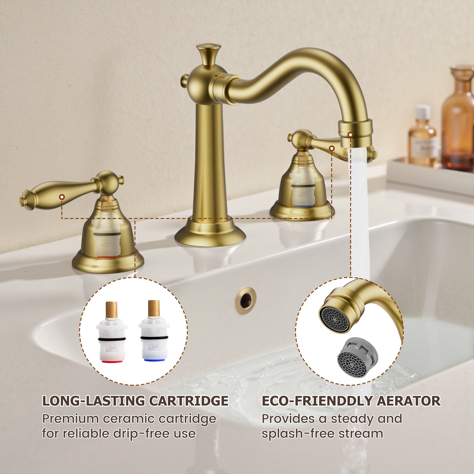 Smooth Brass Ceramic Cartridge & Eco-Friendly Flow: Features a precision-engineered ceramic disc valve rigorously tested for drip-free performance. The aerated stream (1.2 GPM) minimizes splashing while conserving water – ideal for eco-conscious homes.